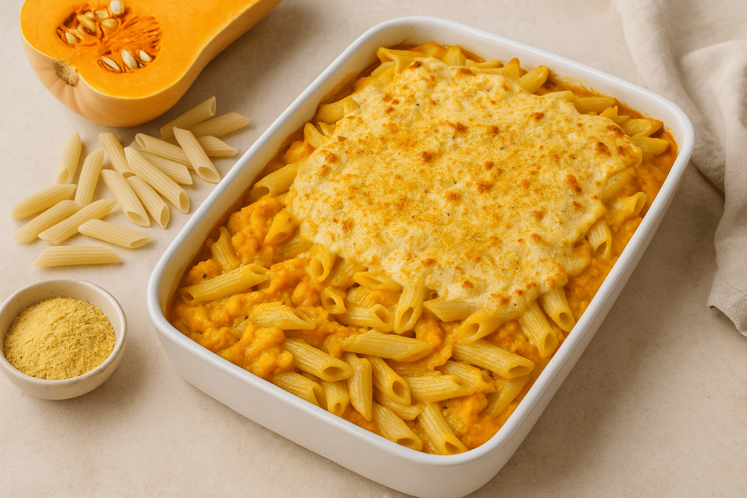Maslena buča je ena najlepših jesenskih darov narave – mehka, sladka, kremasta in polna hranil. Ko jo združimo z brezglutenskimi testeninami iz riža ter rastlinsko omako, nastane jed, ki je hkrati preprosta, hranljiva in izjemno udobna.