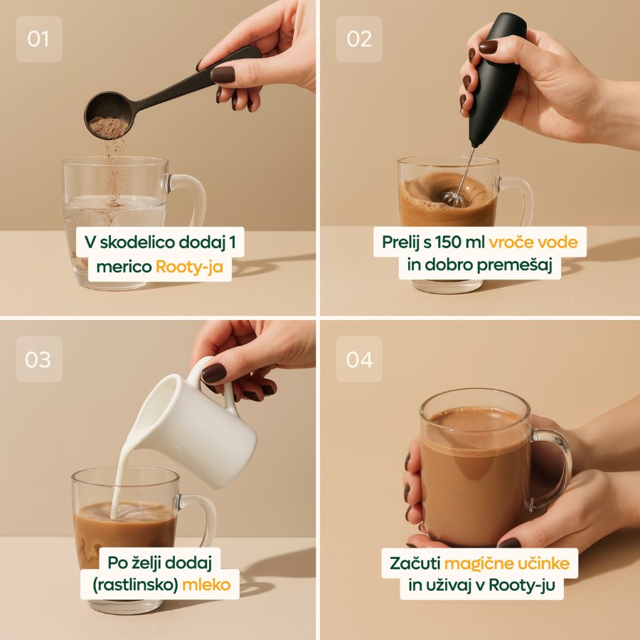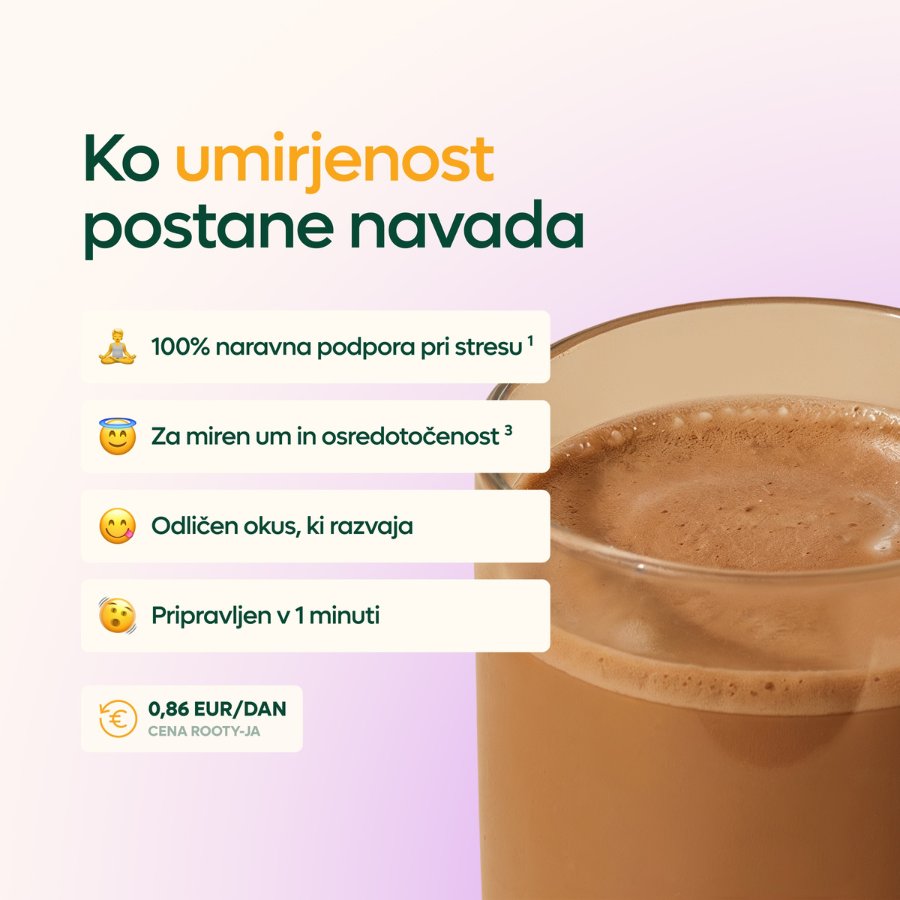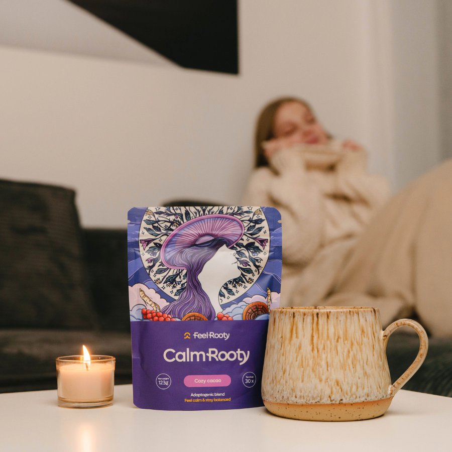 CalmRooty je okusno prehransko dopolnilo v obliki napitka iz adaptogenov, superživil in medicinskih gob, skrbno izbranih za popoln popoldanski ali večerni ritual. Z njim dan zaključiš v mirnejšem ritmu – z umirjenim telesom, sproščenimi mislimi in prostorom za počitek.