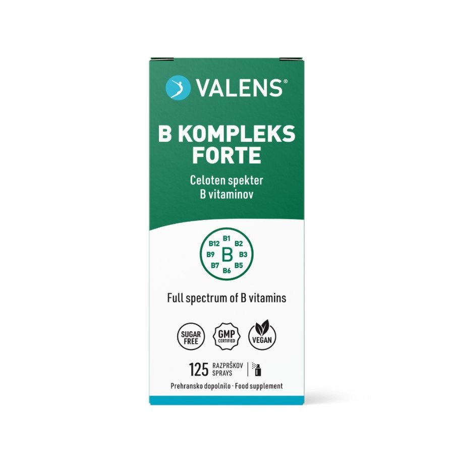 Aktivne sestavine v 4 razprških (0,8 ml): tiamin: 3 mg (273 % PDV*), riboflavin: 1,4 mg (100 % PDV*), niacin: 10 mg (63 % PDV*), pantotenska kislina: 15 mg (250 % PDV*), vitamin B6: 4,2 mg (300 % PDV*), biotin: 50 µg (100 % PDV*), folna kislina: 400 µg (200 % PDV*), vitamin B12: 12,5 µg (500 % PDV*). *PDV – priporočen dnevni vnos